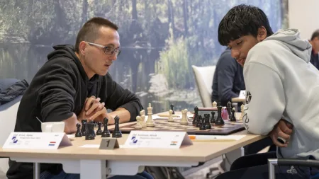 Een wilde opening vol Paardensprongen, maar wel een bekende theoretische variant op het eerste bord tussen Paltrinieri en Zwirs. Aan twee borden had Zwart de overhand, bij WGM Manisha Mohanti Kiran – FM Jaap Vogel had Vogel tegen investering van een pion in de 4. a3 variant van de Franse Winawer goede kansen met Zwart op de Koningsvleugel.