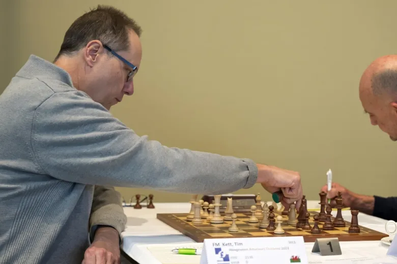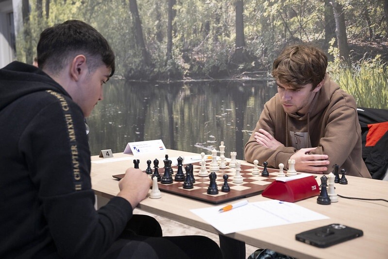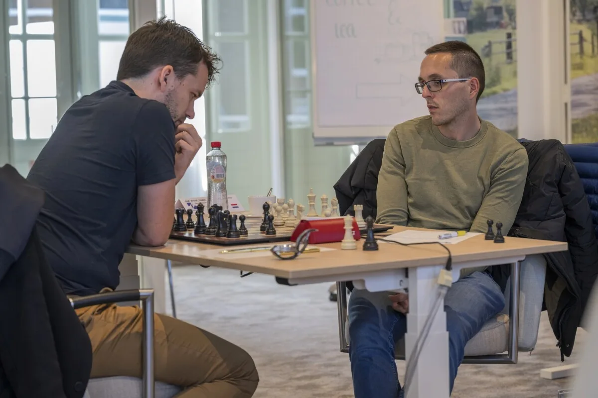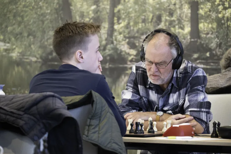 Rob van Helvoort kon zijn extra stuk niet verzilveren tegen Rafael Goudriaan: Hij pakte de verkeerde pion, c5 ipv g5 en berustte in remise.