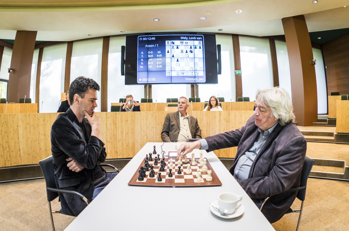 Tournament direct Loek van Wely and living chess legend Jan Timman had a great time in the province house in Assen. They had to play a sharp game while Dutch IM and TV personality Hans BΓΆhm was asking them all kinds of non-chess questions. ‘I was winning somewhere’, Van Wely said. ‘But it was a nice show anyway.’ After that the three played blitz with members of the audience.