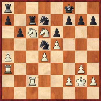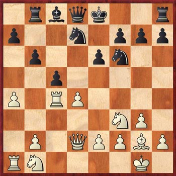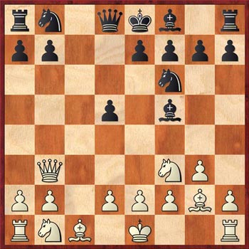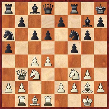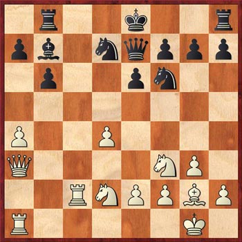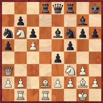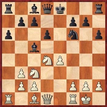 Nu kan wit de thematische opstoot …e7-e5 niet meer verhinderen. 13.Pa4 e5 14.Pb6