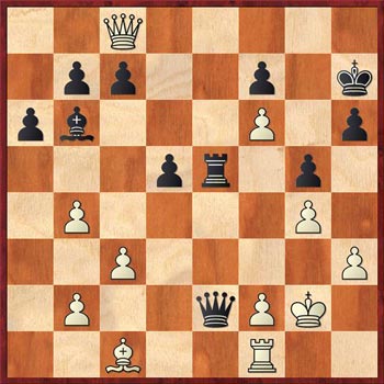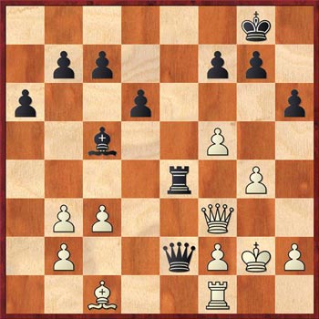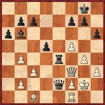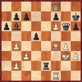 Een fraaie truc was 26…Le4! 27.Dxe4 Lxc3 28.Dd3 Lxd2+ en wit heeft te weinig voor het materiaal. Dit kon op de volgende zet ook nog. 27.h4 Tce8?! 28.h5 Lh8 29.Pd5 Lxd5 30.Dxd5 Dc4 31.Df3 Te2 32.g6 fxg6 33.hxg6 Tc8