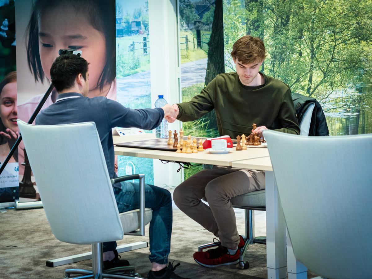 The ‘walrus fight’ McShane-Van Foreest did not end bloody today: everything remained within bounds. The players said afterwards that there are very many possibilities for both sides in this variation, without the balance tipping in any way. It was drawn in 30 moves.