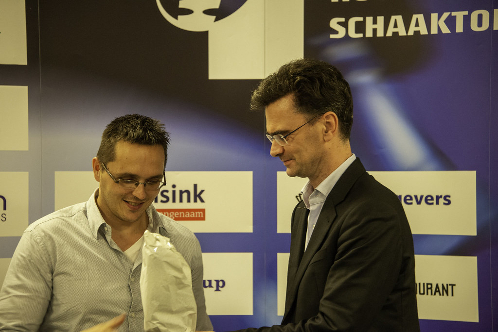 De eerste Deloitte NK-finalist was Robin Swinkels! Ilias van der Lende begon tegen hem rustig maar speelde het niet al te handig. Hij kreeg problemen met een zwakke pion op e5. Dus offerde hij die voor een aanval op de zwarte koning, maar die had te weinig kracht: de volle winst en een overtuigende plaatsing voor de dertiger uit Brabant, die eerder een der grote favorieten, Ivan Sokolov, uitschakelde.