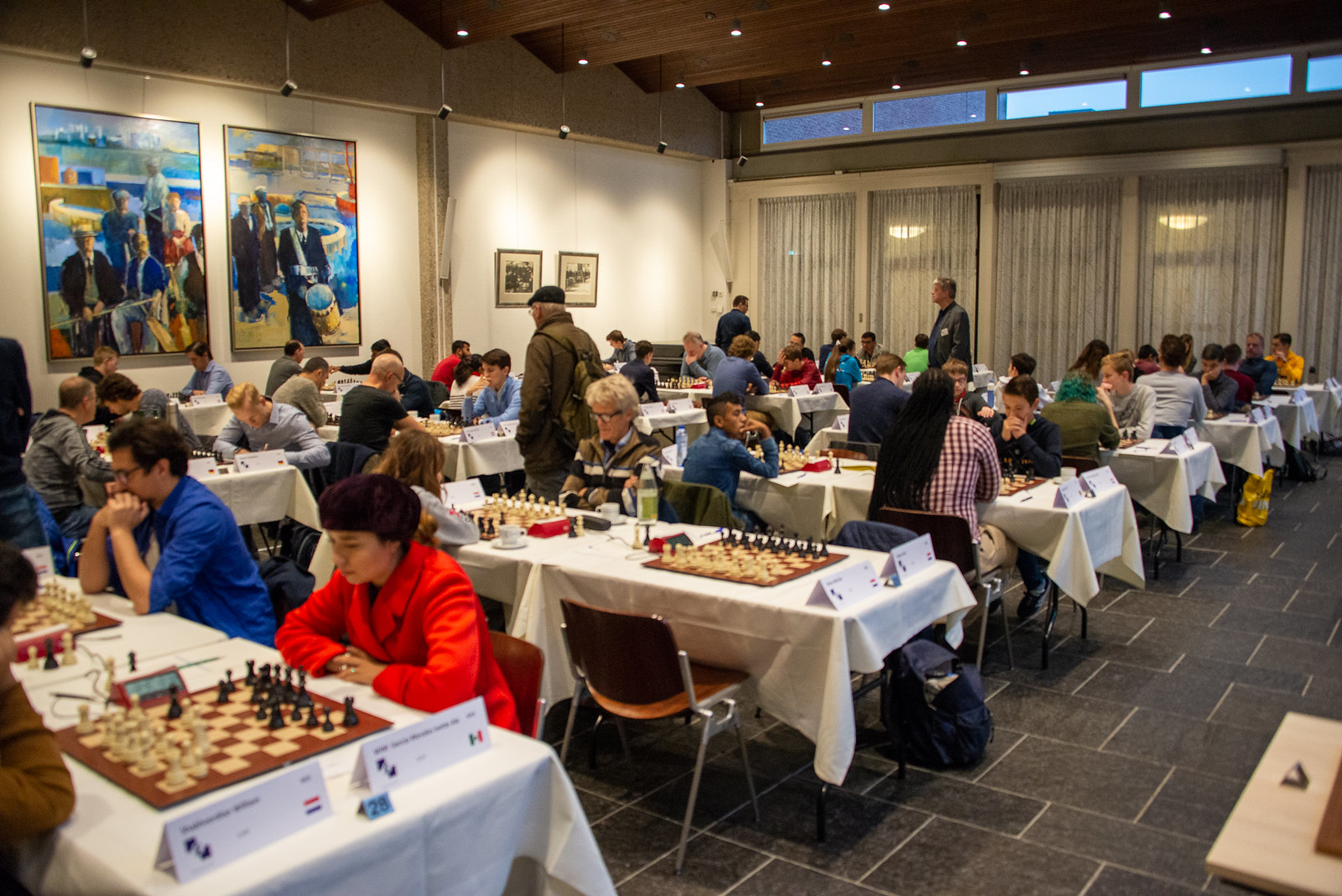 In front of a big crowd, Javokhir Sindarov and Sipke Ernst are playing a fascinating game on board 1. Ernst has put some big guns on the b-file, but Sindarov countered with an attck on the exposed black king. On move 30 he missed (or rejected?) 30.Rd3 after which he would have been an exchange up, and one move later he should perhaps have gone for the slightly worse ending after 31.Rdxe7 etc. After 31.Rxc7? Ernst could preserve his bishop and organize his defence.