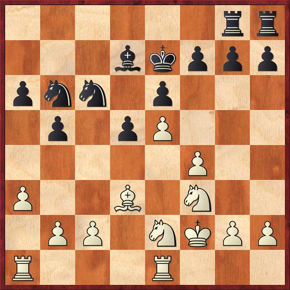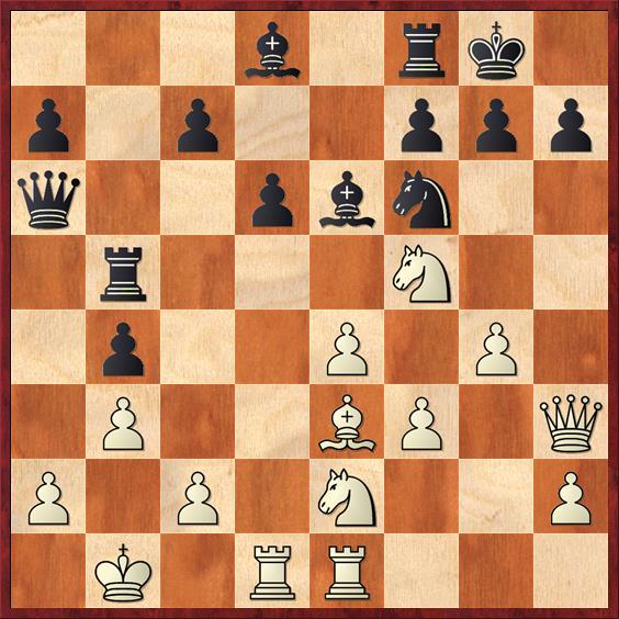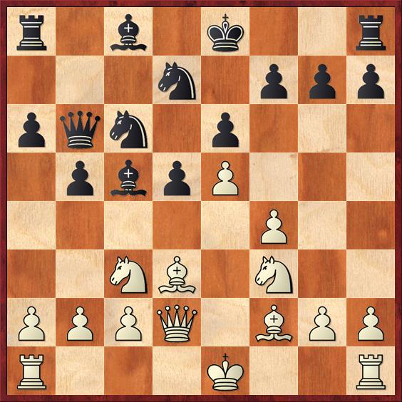 After 24…Kg8 many roads lead to Rome, but the simplest is 25.Qg5+ followed by 26.e5, winning back the piece. But now we see why White’s 10th move was so useful.
