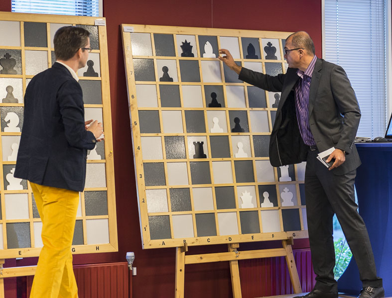 Sokolov toont de partij aan het publiek en commentator Jop Delemarre. Foto: Lennart Ootes