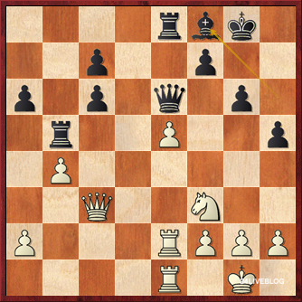 Hell’s breaking loose again in the Iranian-Peruvian match! Firouzja has gone for the win of a ‘small exchange’ on f6. Cori sacked an exchange on c3 in return. Now Black has the small combi 26…Bxg2+ 27.Kxg2 Qg4+, winning an exchange back, when White emerges with two pieces vs rook.