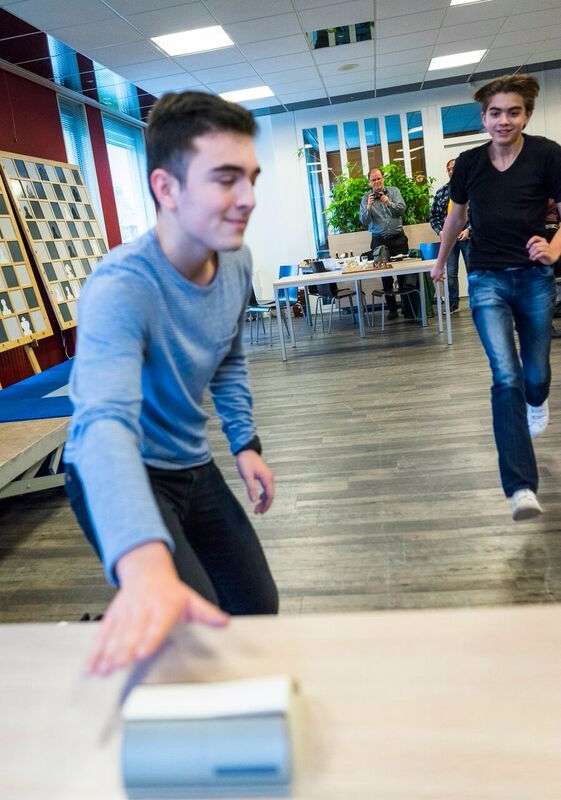Robby Kevlishvili gave a nice demonstration of ‘condition chess’ today. The event, where the clock is put on some distance from the board so you have to run after every move, wasn’t held on the Hoogeveen streets due to the weather, but in the foyer of the town hall after Jan Timman had finished his clock simul there.