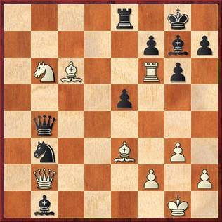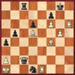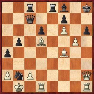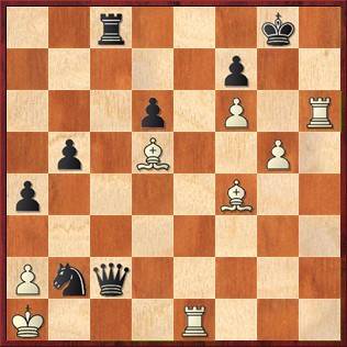 Here White played 30.Nd5, where 30.Qxb1 would have won. The game move allowed 30…Qe1+ 31.Kg2 and now the long diagonal is blocked too: 31…Be4+ 32.Rf3 Bxf3+ 33.Kxf3… while the other one is opened!: 33…e4+ 0-1.