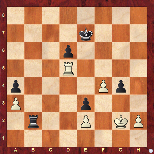40.Kg3? 40.Rd3 Rxe2+ 41.Kg3 was a draw. 40…Rd2! Forcing the white rook to budge after which the d-pawn has free passage. 41.Ra5 41.Rd3 Rxd3 42.exd3 Kf6 and White ends up in zugzwang. 41…Rxe2 42.Rxa4 d5 43.Rd4 Rd2 Once more, kicking away the rook. 44.Rb4 d4 And now the rook and two pawns could do it all by themselves.