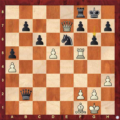 Here, Dardha played 28.Rf3? after which Black could slowly consolidate. More crucial would have been the exchange sacrifice 28.dxe6 gxf5 29.Bc4, said Warmerdam. ‘I heard it was about plus 1.5, but in practice this is not easy to play.’ Probably best here is 29…Qc1+ 30.Kh2 Qf4+ 31.Kg1 h6!, not worrying about the one check on f7 and eliminating any perpetuals. White has not enough compensation for the material.
