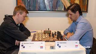 Sipke Ernst has also hauled in a full point, against Moksh Amit Doshi, who had surprised him in a Nimzo-Indian with a pawn sacrifice that was supposed to have been played by Magnus Carlsen. Ernst started an attack on Black’s king without the queens but both players missed a good counterchance for Black. Then it was soon over. Thomas Beerdsen won’t be satisfied; he must have counted on a white point against Stefan Tabak, but the latter didn’t give an inch and took the draw from a position of strength: in the final position after 31…Re8 32.Kh2 Qh5 White will be in trouble in the rook ending since his a-pawn is vulnerable.