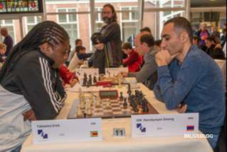 Erick Takawira has scored his first full point, against 13-year-old Loek van der Hagen. The man from Zimbabwe was attacking all the way and after the crazy counterattacking move 26…Bxb2 by Loek, he had to lay down his king in the end.