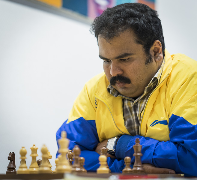 Sundar Shyam won heel snel een stuk tegen landgenoot Rakesh Kumar Jena. Casper Schoppen hield na een goede voorbereiding zijn tweede grootmeester op remise: de sterke Chanda Sandipan. Hij kwam met zijn trainer Dimitri Reinderman nog even uitleg geven in de commentaarzaal bij Hans Böhm.